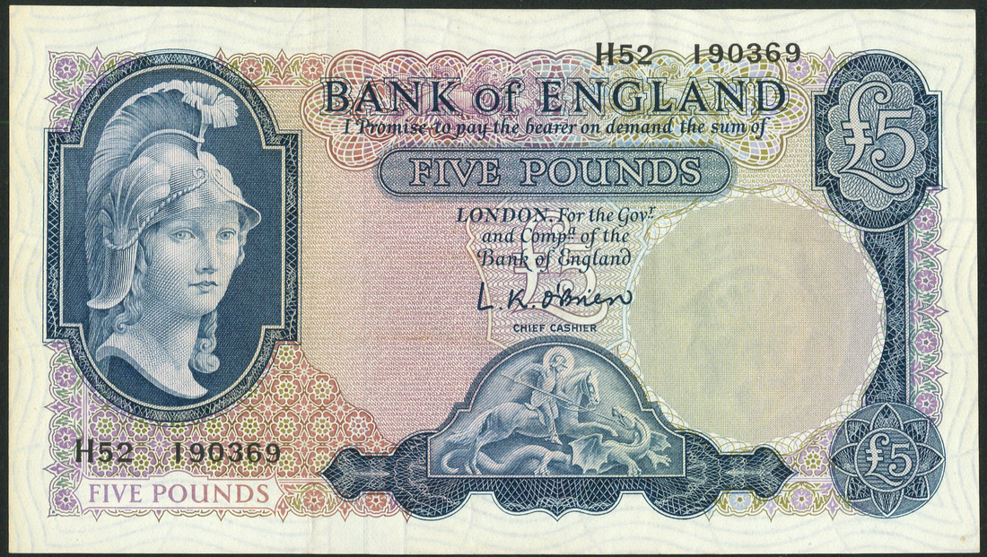 Bank of England, a group of notes comprising, £5, L K O'Brien, ND (1961), serial number H52 190369, (first series), £5, J Q Hollom, ND (1963), serial number N76 919154, £5, J B Page, ND (1973), serial number CU12 16802, £5, G E A Kentfield, ND (1991), serial number T47 113087, and £5, M Lowther, ND (1999), serial number LL74 858378 (replacement)