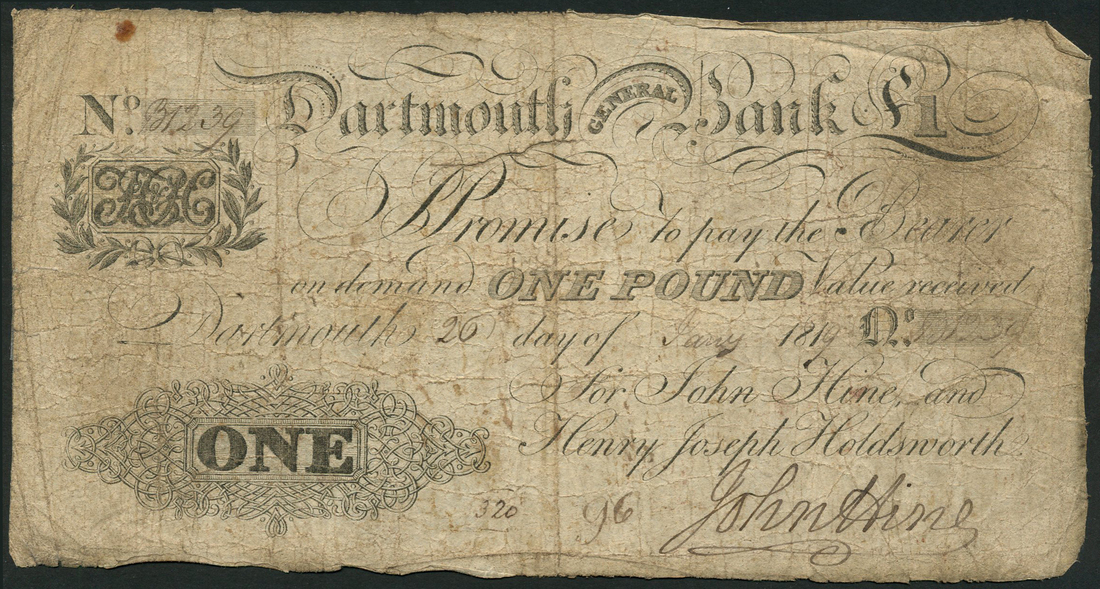 Dartmouth Bank, John Hine and Henry Joseph Holdsworth, £1, 1819, serial number 1239, black and white, bank title top centre, bank logo top left, value in ornate tablet low left, also Newcastle upon Tyne, £5, 1840, serial number 7281, black and white, ships in harbour top centre, together with £1 (2), Warren Fisher, ND (1923), serial numbers K1 50 964621 and P1 54 015780, both feature portrait King George V at right, St George and dragon at left