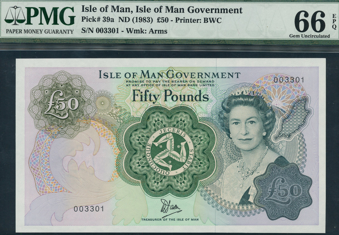 Isle of Man Government, £50, ND (1983), serial number 003301, green on multicolour underprint, portrait Queen Elizabeth II at right, Triskelion at centre, value top left, centre and low right, reverse, Douglas Bay 1841