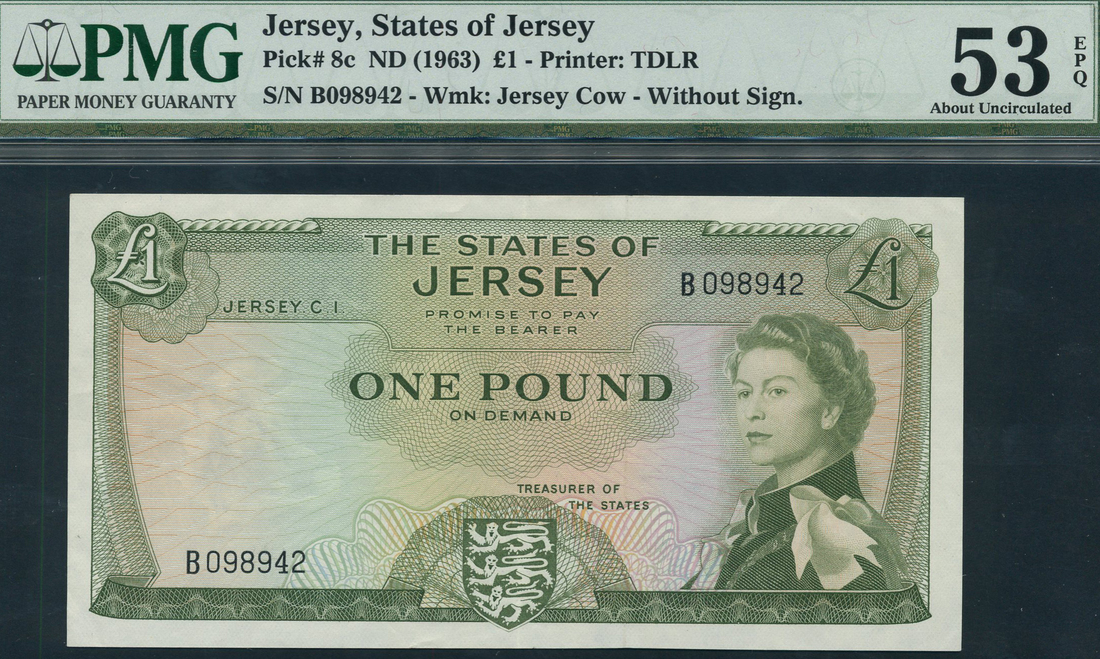 States of Jersey, £1, ND (1963), serial number B 098942, olive green on pastel underprint, portrait Queen Elizabeth II at right, arms low centre, value top left, right and at centre, reverse, Mont Orgueil Castle
