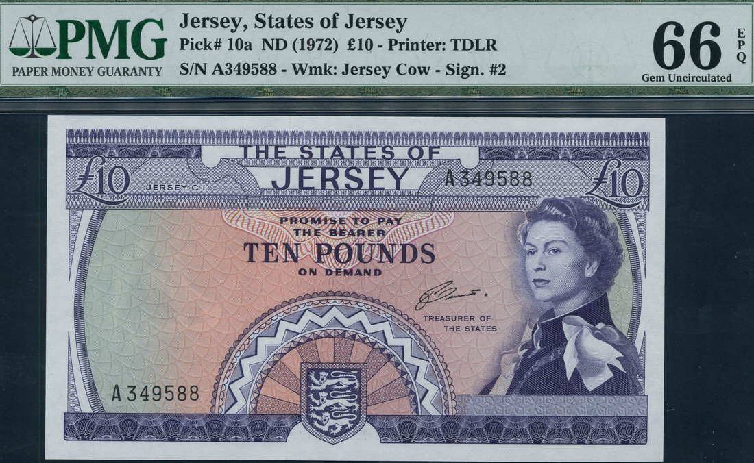 States of Jersey, £10, ND (1972), serial number A 349588, purple on multicolour underprint, portrait Queen Elizabeth II at right, arms low centre, value top left, right and at centre, reverse, St Ouen's Manor