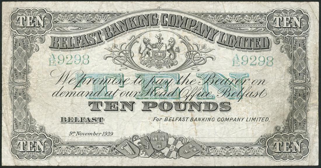 Belfast Banking Company Limited, £10 (2), 1938 and 1939, serial number prefixes A/Cand A/E, black on green underprint, arms at top centre, and at left and right