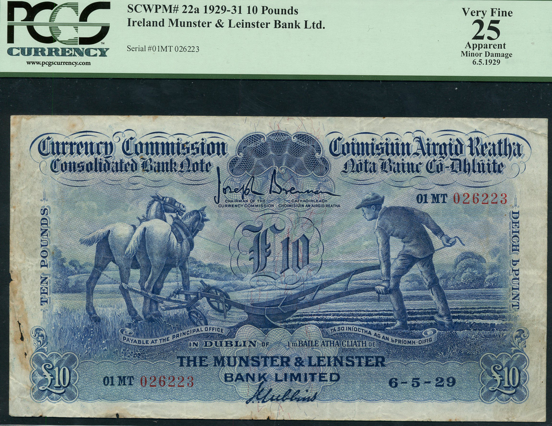(x) Currency Commission, Munster and Leinster branch, £10, 6-5-29, blue prefix 01MT, blue and mauve, ploughman and team in field, Brennan and Gubbins signatures, reverse blue, the Currency Commission building, Dublin