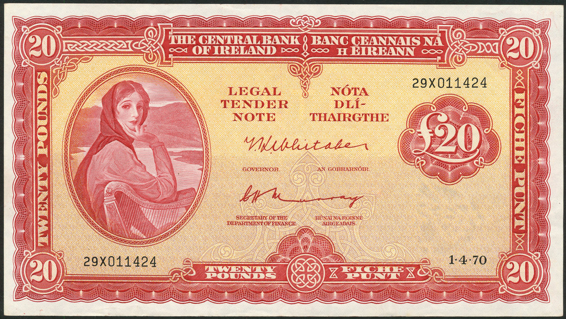 (x) Central Bank of Ireland, £20 (2), 1 April 1970, serial numbers 29X 011423/424, red and pale orange, Lady Lavery at left, Whitaker and Murray signatures, £1 (4), 1969, 1974, 1975 (2), green, also 10 shillings (2), 1968, orange and pale green