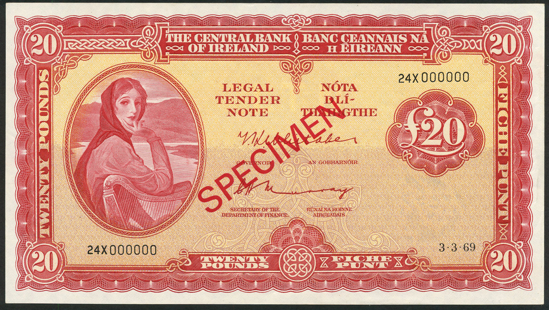 (x) Central Bank of Ireland, specimen £20, 3 3 March 1969 serial number 24X 000000, red on pale yellow underprint, Lady Lavery leaning on a harp in oval at left, value at lower centre and in each corner, reverse mask of River Boyne at centre, T.K Whitaker and C.Murray signature, red SPECIMEN overprint two De La Rue specimen ovals on obverse and reverse,