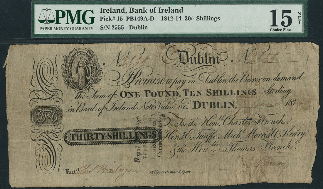 (x) Dublin Bank, Ffrench, Taaffe, Keary and Ffrench, £1 and 10 shillings, 9 June 1814, serial number 2555, black and white, maiden top left, two manuscript signatures below