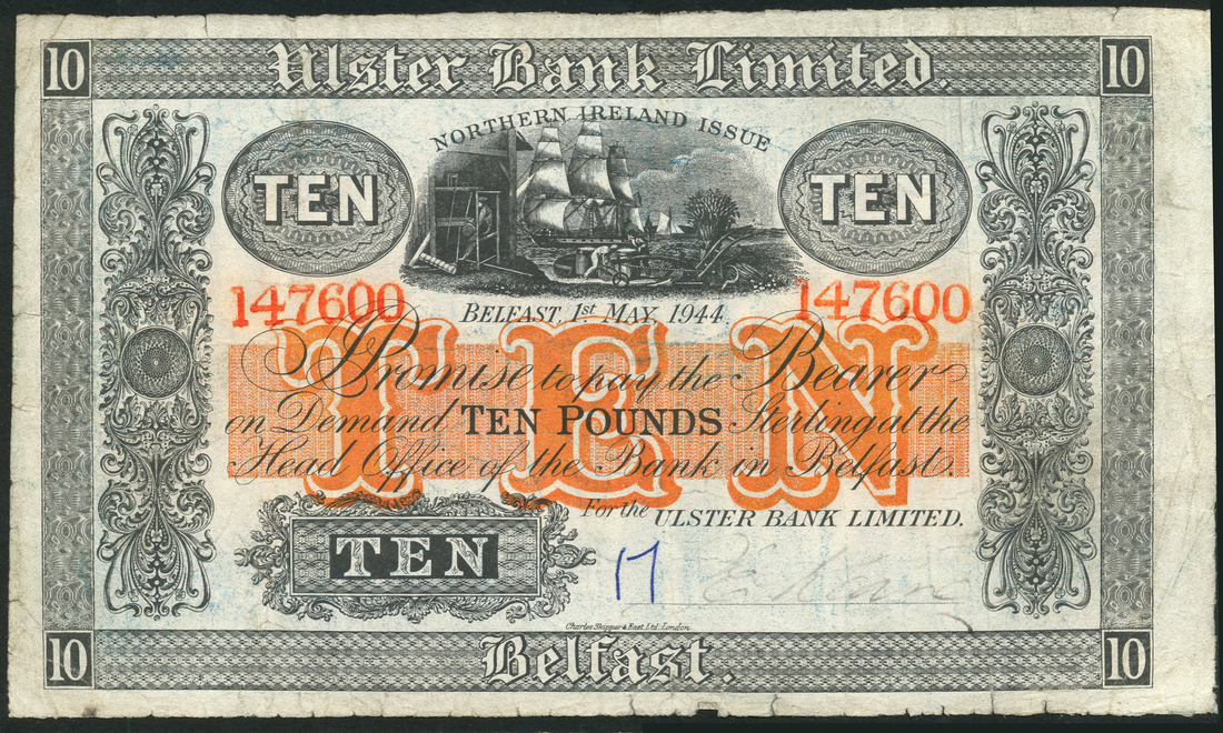 (x) Ulster Bank Limited, £5, 1 January 1936, black and white, value in green, also £10, 1 May 1944, value in orange at centre, both handsigned