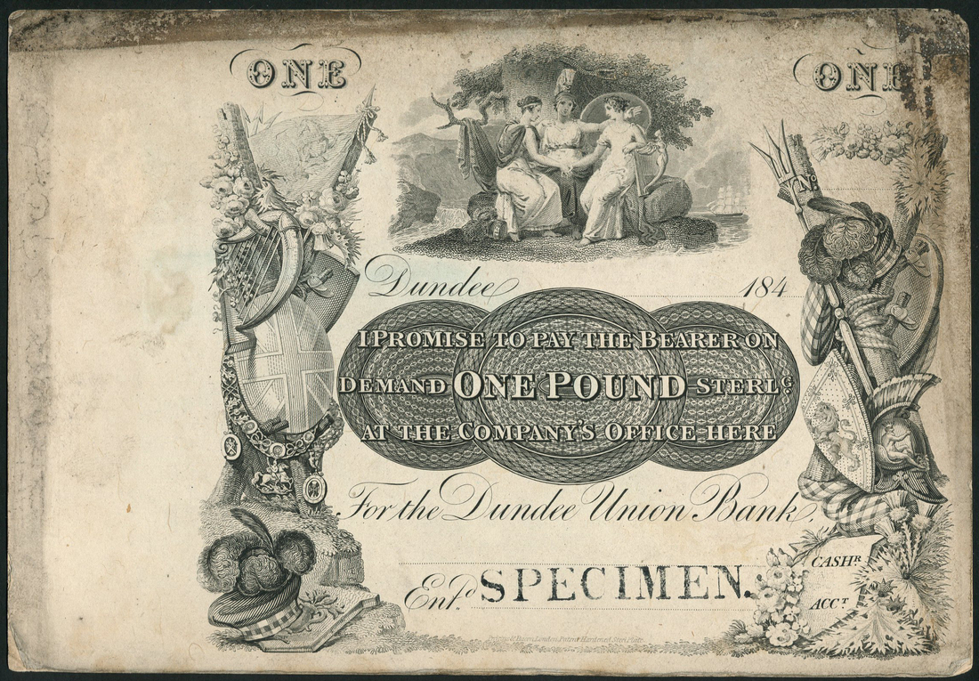 (x) Dundee Union Bank, proof on card for £1, ND (184-), black and white, showing three female allegories at top centre, armour, shields and uniforms at left and right