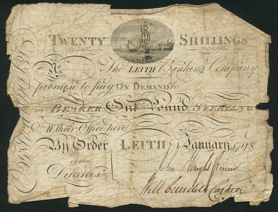 (x) Leith Banking Company, 20 shillings, January 1798, uniface, black and white, sailing ship in full mast entering Port of Leigh at top centre