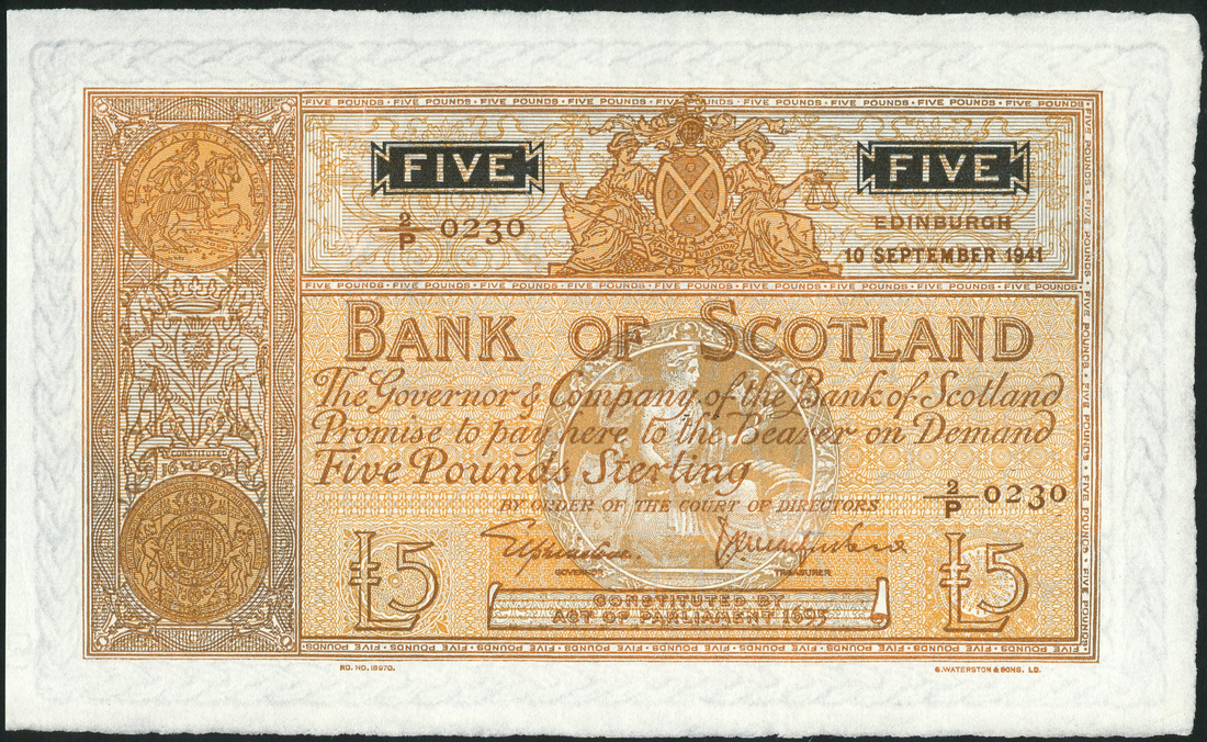 (x) Bank of Scotland, £5, 10 September 1941, serial number 2/P 0230, orange-brown, arms and unicorns at left in grey, Great Seal of Scotland, Scotia in circular grey panel right centre, Elphinstone and Beveridge signatures, reverse blank