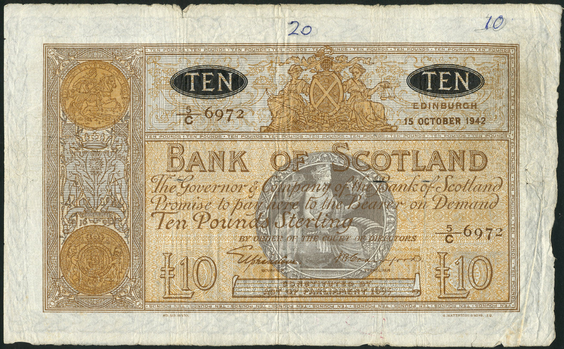 Bank of Scotland, £10, 15 October 1942, serial number 5/C 6972, brown on light orange underprint, thistle motif in panel at left, bank arms flanked by value in black tablets top centre right, grey medallion at low centre with bank title above, Elphinstone/Crawford signature