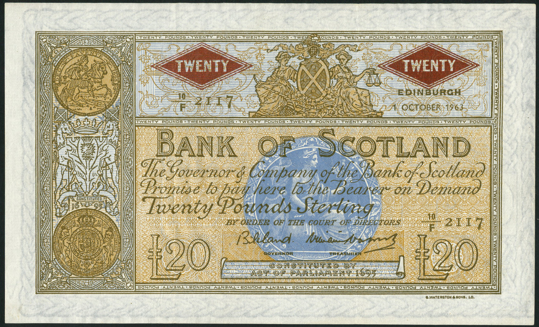(x) Bank of Scotland, £20, 2 October 1963, serial number 10/F 2117, uniface, brown and light orange, bank arms top centre flanked by value in reddish-brown tablets, thistle motif on panel at left, blue medallion low centre with bank title above, Bilsland/Watson signature