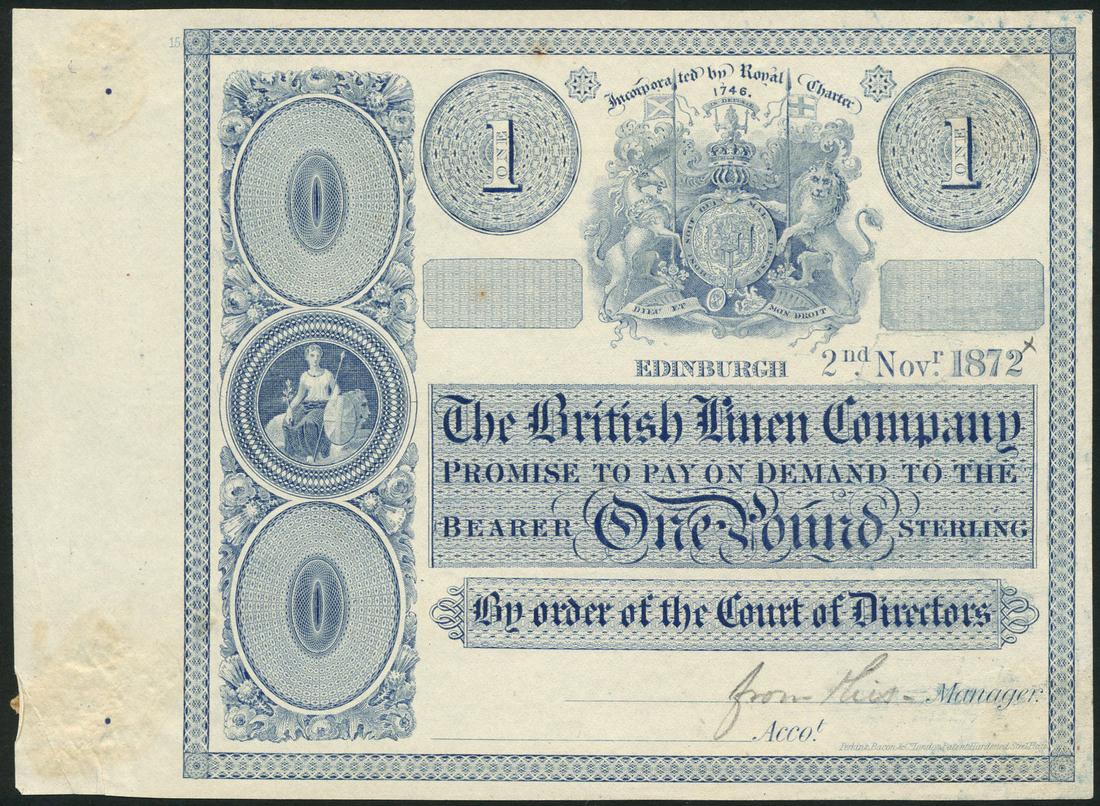 (x) British Linen Bank, proof £1 on paper, 2 November 1872, blue and white and proof £1 on paper, 2 February 1872, black and white, both arms top centre, Britannia left centre