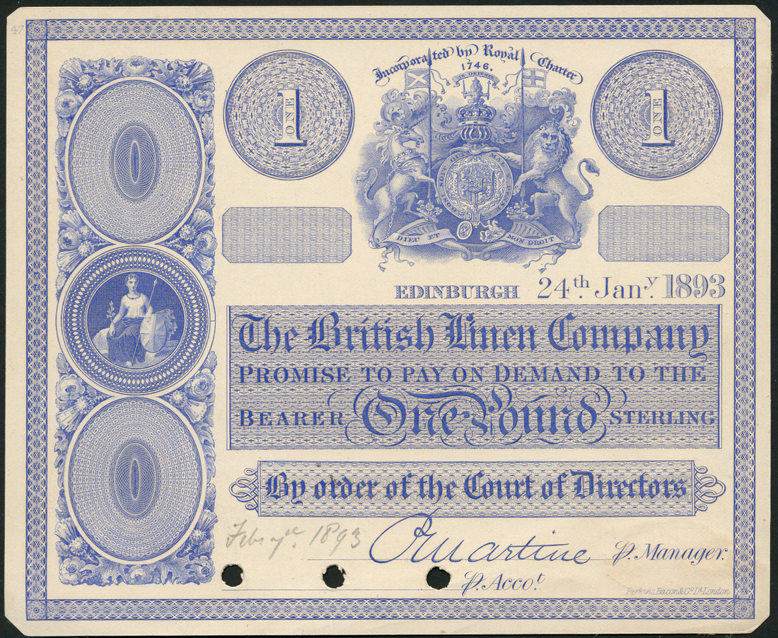 (x) British Linen Company, a group of proofs on card comprising £1, 24 January 1893, uniface, blue text, £1 (2), 22 September 1898, 4 March 1902, black print, all with royal arms top centre flanked by value in circular frames, Britannia bank emblem in panel at left, hole punched