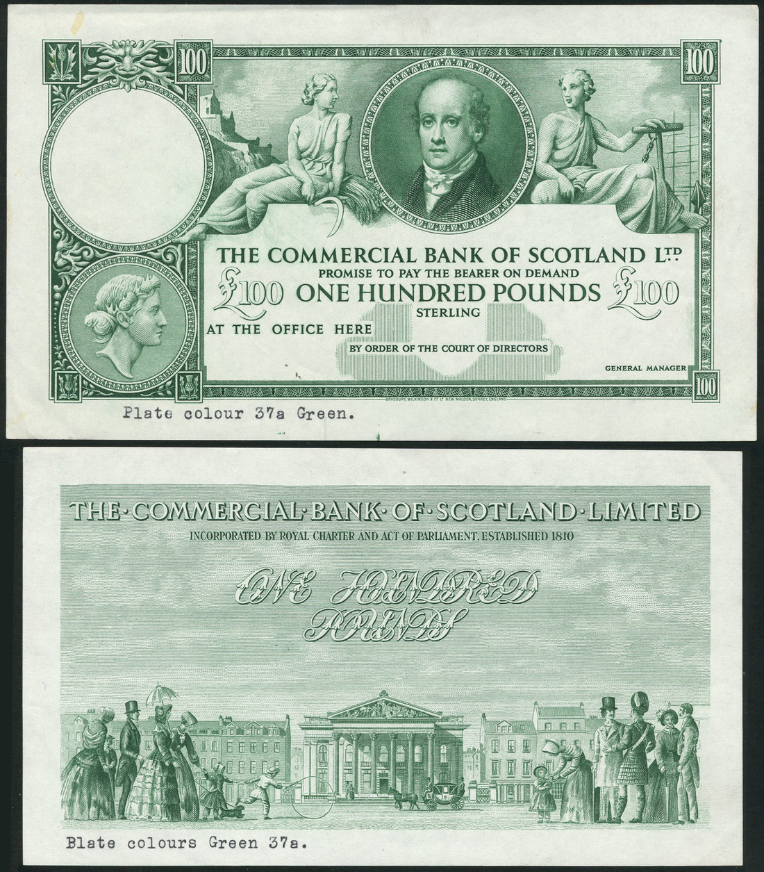 Commercial Bank of Scotland Limited, obverse and reverse die proofs for £100, ND (1947), green, Lord Cockburn at top centre, flanked by allegorical maidens, medallic head of Scotia at low left, reverse green, Edinburgh Street scene at centre