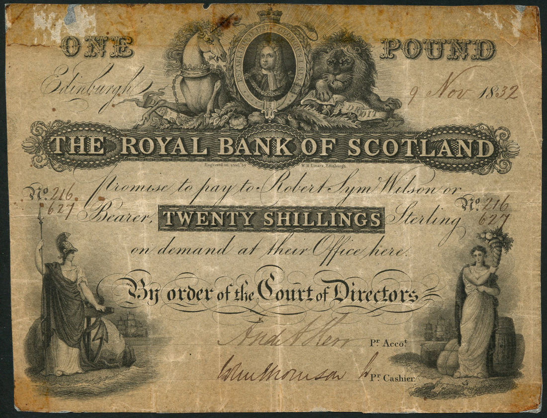 Royal Bank of Scotland, 20 shillings, 9 November 1832, serial number 216/627, black and white, portrait King George I flanked by unicorn and lion at top centre with bank title below, female figures at low left and right, value in black tablet at centre, payable to Robert Sym Wilson or bearer, manuscript signatures