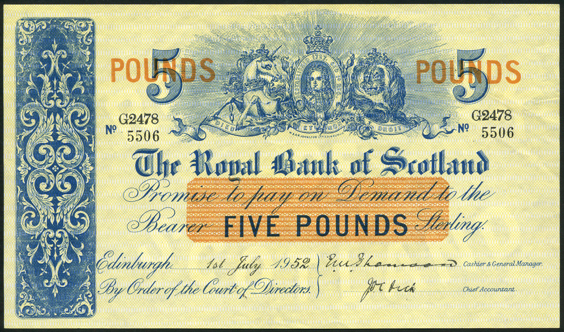 Royal Bank of Scotland, £20, 1 May 1957, prefix G, blue, yellow and brown, arms top centre, Ballantyne and Campbell, also £5 (2), 1952 and 1957