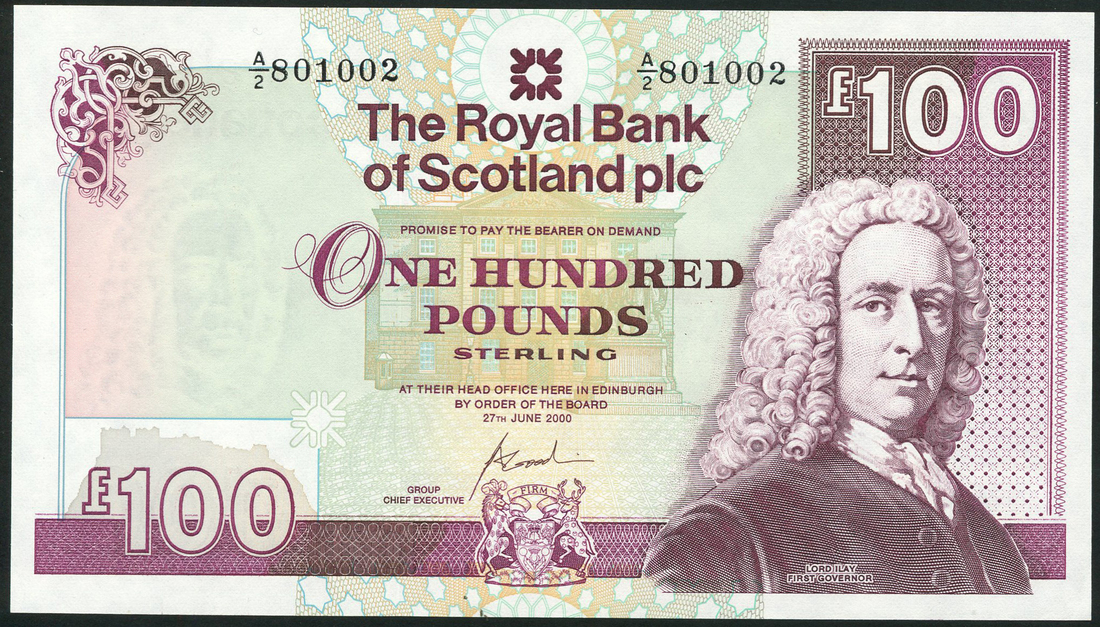 Royal Bank of Scotland plc, £100, 27 June 2000, serial number A/2 801002, purple on multicolour underprint, portrait Lord Ilay at right, bank title top centre, bank arms low centre, value low left and top right and at centre, reverse, Balmoral Castle
