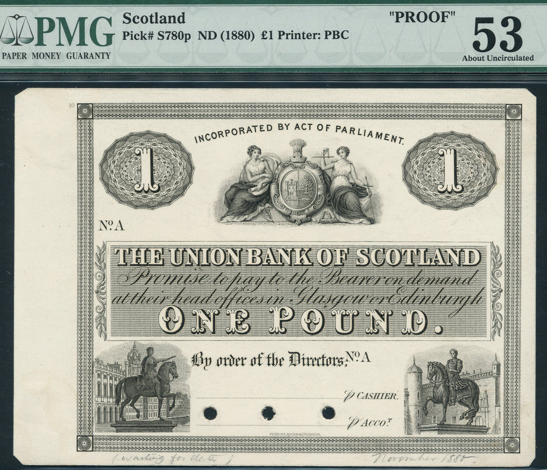 (x) Union Bank of Scotland, proof on card for £1, ND (1880), black print, arms top centre, value in tablet at centre flanked by equestrian statues
