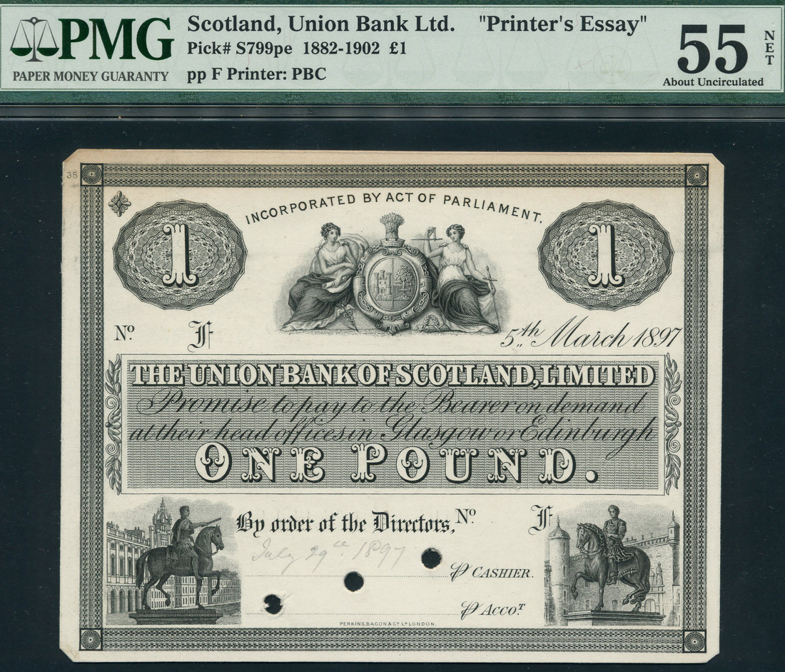 (x) Union Bank of Scotland Limited, proof £1 on card, 5 March 1897, black and white, arms at top centre, value in circular panel top left and right, equestrian statue low left and right