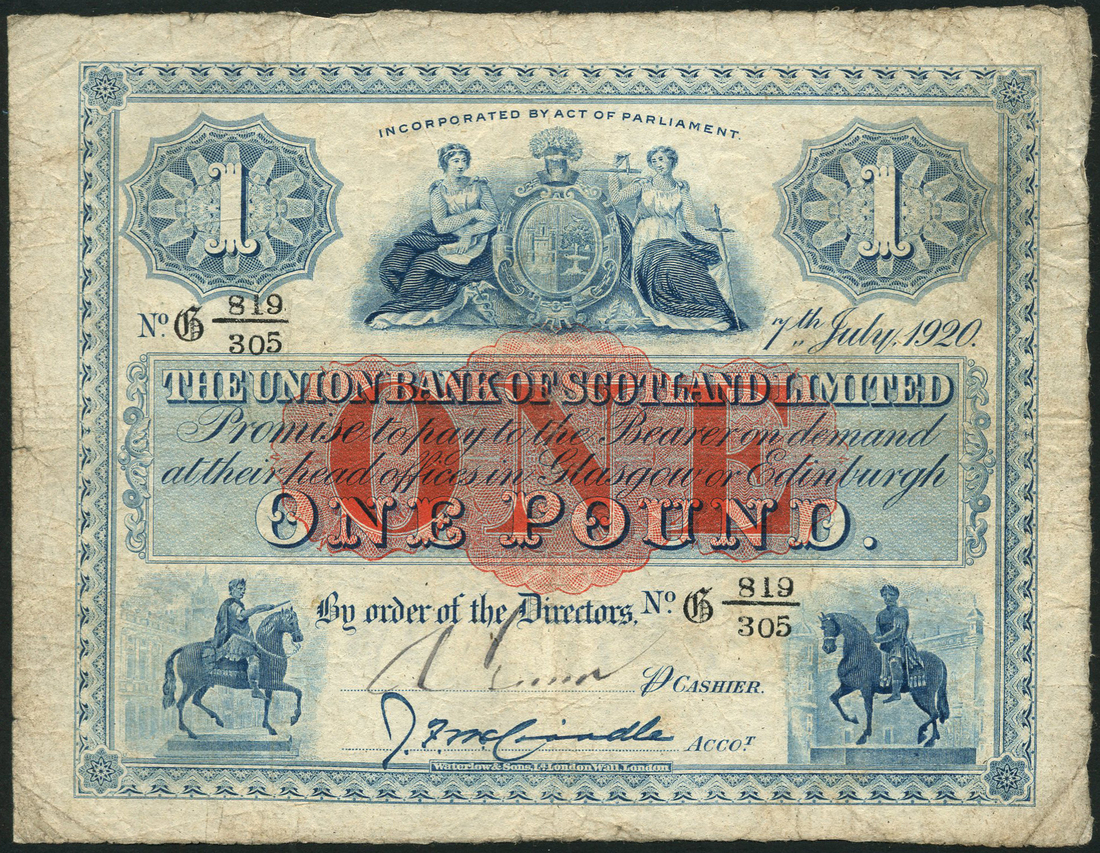 Union Bank of Scotland Limited, £1, 7 July 1920, serial number G 819/305, blue, bank coat of arms flanked by value in ornate tablets top centre, equestrian statues low left and right, red ONE at centre, McCrindle signature, reverse, bank title and value in guilloche pattern
