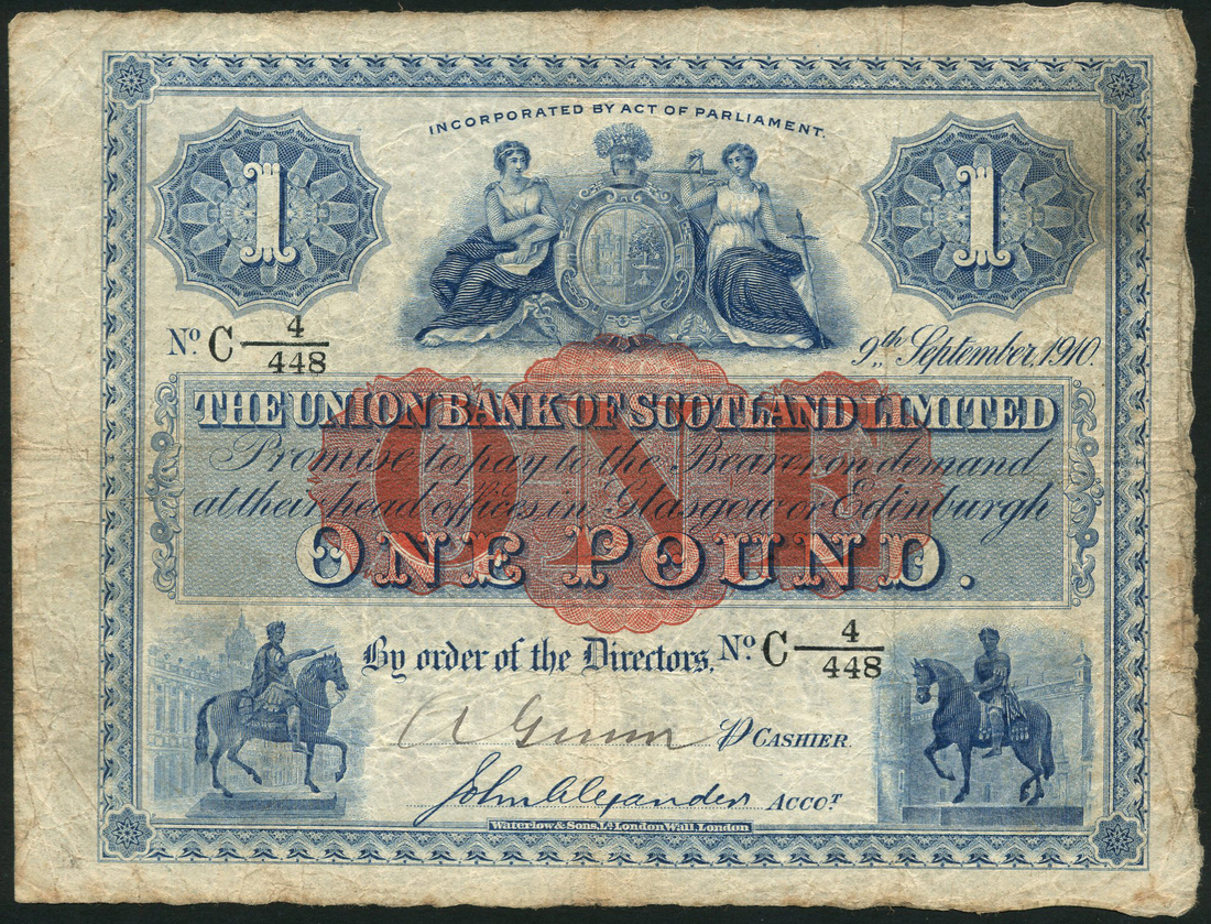 Union Bank of Scotland Limited, £1, 1 October 1921, serial number A494719, £1, 9 September 1910, serial number C 4/448, blue, bank coat of arms flanked by value in ornate tablets top centre, equestrian statues low left and right, red ONE at centre, Hird/McCrindle signatures, reverse, bank title and value in guilloche pattern