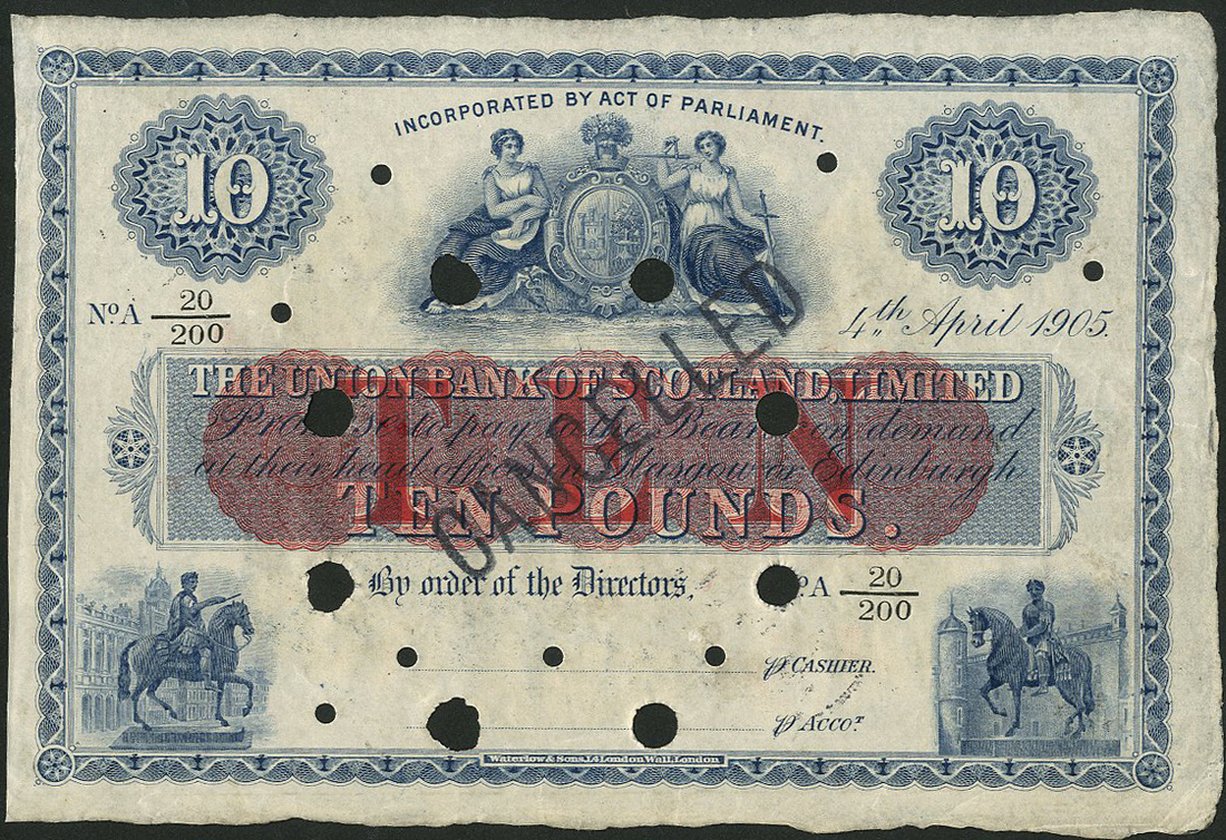 Union Bank of Scotland Limited, uncut pair £1, 2nd November 1923, blue, yellow and orange, arms top centre, equestrian statue low left and right, value top left and right, specimen £10, 4th April 1905, blue and white with red underprint, design as previous