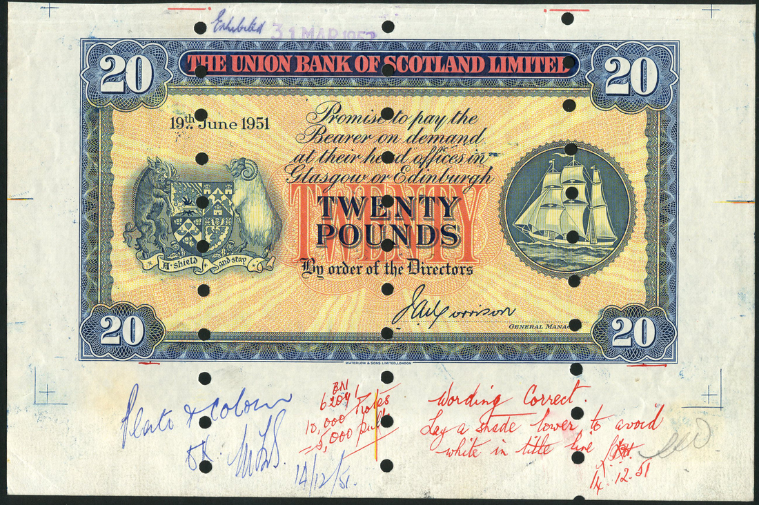 (x) Union Bank of Scotland Limited, a specimen £20, 19 June 1951, no serial number, blue, yellow and red, arms at left, ship at right, Morrison signature, multiple punch holes