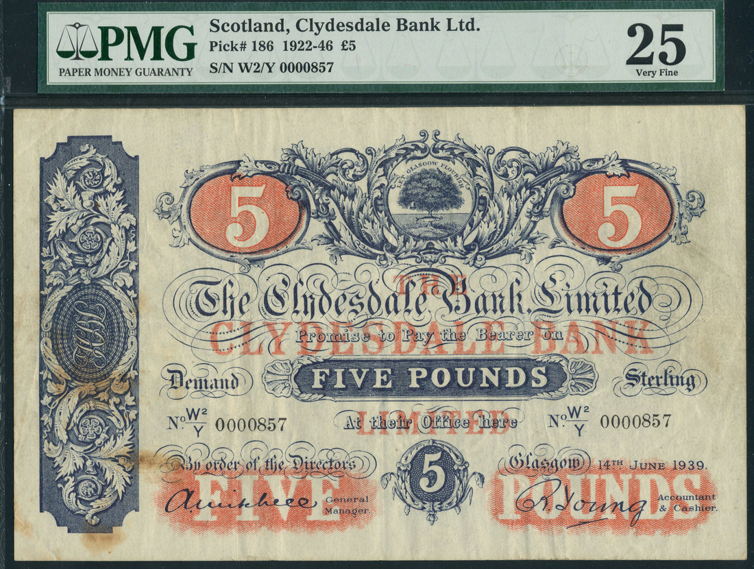(x) Scotland, a miscellaneous group comprising Commercial Bank of Scotland, £20, 1954, Royal Bank £1, 1965, British Linen £1, 1964, £5, 1962, Clydesdale £1, 1966, Clydesdale and North of Scotland Bank £20, 1961 and a Clydesdale £5, 1939,