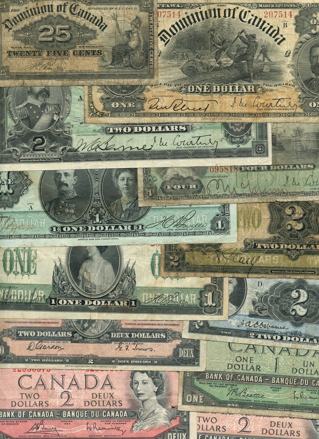 Canada, a group of notes comprising, Dominion Bank of Canada, 25 cents, 1900, Pick 9, $1, 1898, Pick 24, $2, 1897, Pick 24Ca, $4, 1900, Pick 25, $1, 1911, Pick 27a, $2, 1914, Pick 30, $1, 1917, Pick 32, also, Bank of Canada,