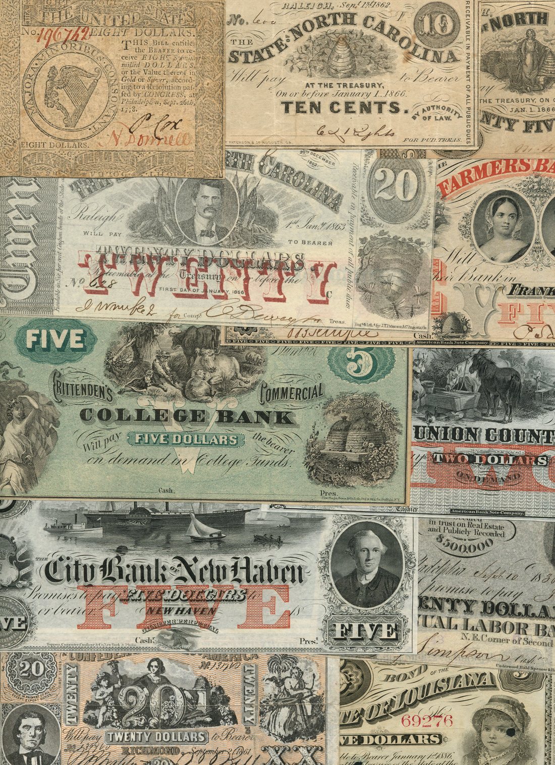 Crittenden's Commercial College Bank, Philadelphia, $5, ND, The Union County Bank, Plainfield, $2, 1859, City Bank of New Haven, $5, ND, Manual Labor Bank, $20, 1838, Confederate States of America, Richmond, $20, 1861 (forgery), Broadway Bank 5 and 10 cents, 1862, State of Louisiana $5 "baby bond", 1886, Military Payment Certificate, 10 cents, Pick M30, $1, Pick M72E, $1 (2), 1957, Pick 419a, b, $1, 1981, Pick 468, $1, 2003, Pick 515, $2 (4), 1976, Pick 461, $5, 1974, Pick 456, $5, 1977, Pick 463, $5, 2003, Pick 517, $100, 1981, Pick 467, together with a group of facsimile notes with accompanying explanatory leaflet