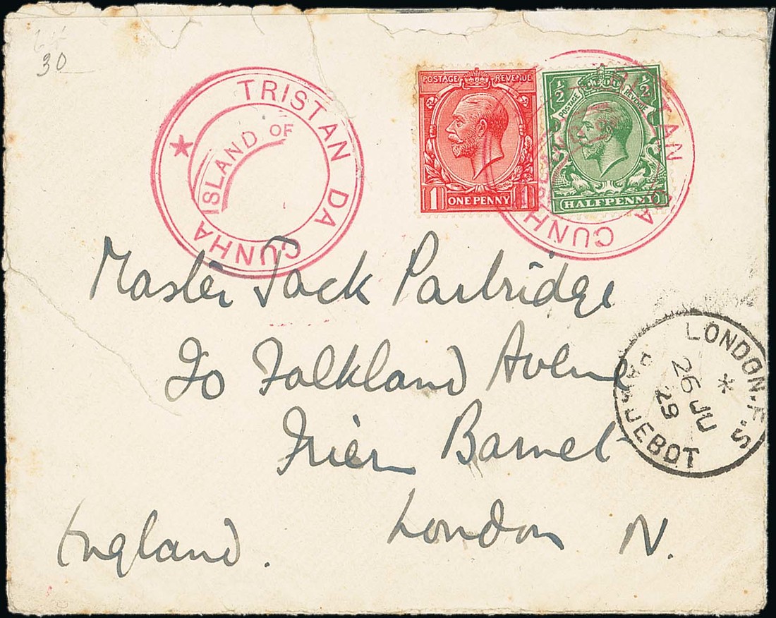 1929 (10 Feb.) envelope (opened-out) from A.B. Partridge "Priest and Viceroy of Tristan da Cunha" to London, bearing G.B. ½d. and 1d. sharing a fine strike of the very rare "tristan da cunha/island of" handstamp in red with a further superb strike alongside, London Paquebot arrival c.d.s. (26.6) at foot, the reverse with a further strike of the handstamp with "island of" portion struck above the rest and dated "10-2-29" in manuscript; envelope with tear at left and a few small faults through opening though attractive and very rare.. S.G. C55,500. Photo
