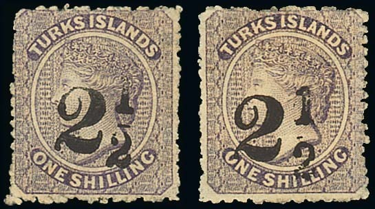 "2½" Setting 5 on 1/- lilac, two different types, one with small part original gum and horizontal crease, the other without gum and a little toned. B.P.A. Certificates (2007 and 2014 respectively). S.G. 29, £1,100