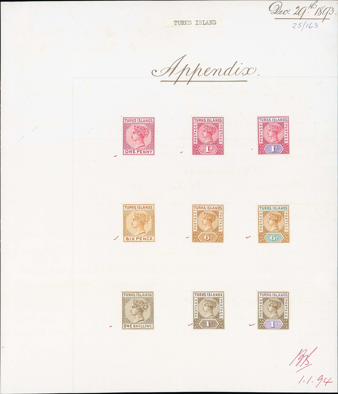 1893 (29 Dec.) "Appendix" sheet (203-237mm.) bearing three general Keyplate imperforate trials and six Postage Postage imperforate trials, each with handpainted country name and all but two of the Postage Postage trials with handpainted value tablets, the sheet initialled at foot and further dated "1.1.94", two light creases, one crossing three of the trials. A wonderful exhibition item. Photo