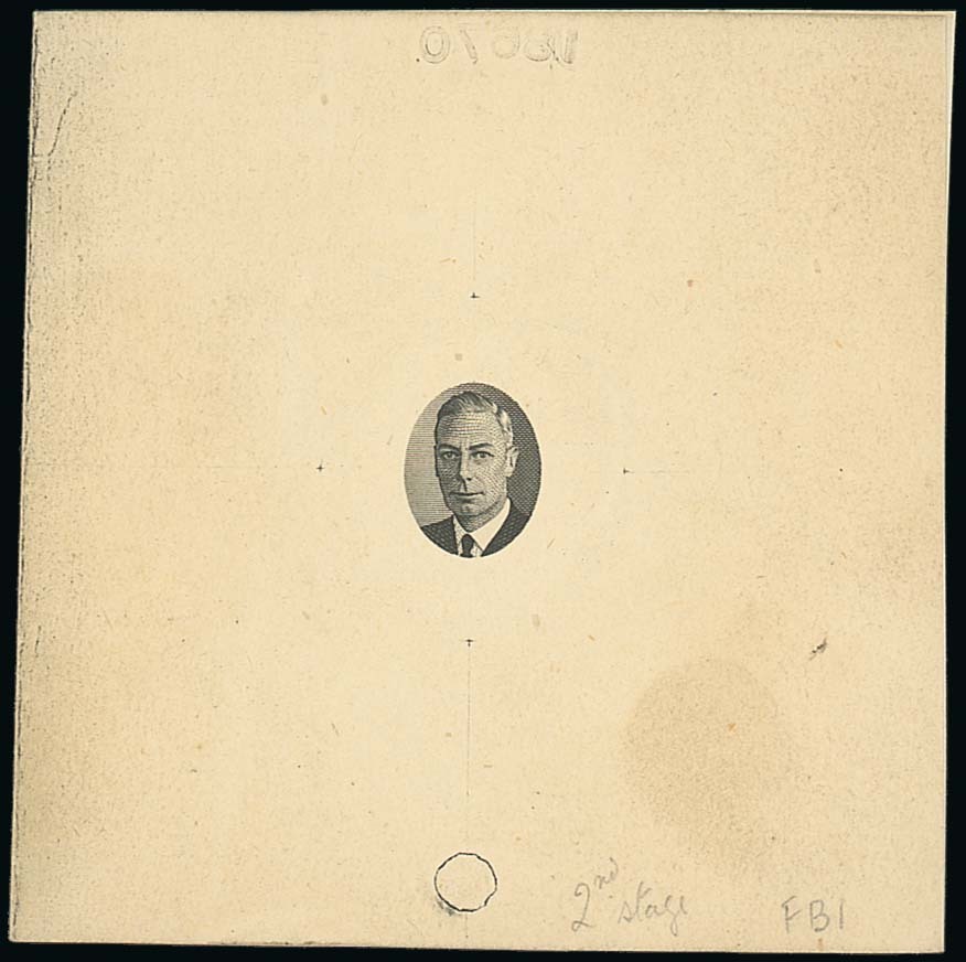 1950 die proof of the head in oval surround, in black on surfaced wove paper (70x71mm.) with die number in reverse at top, marked "2nd stage" in pencil at foot; light crease clear of the die impression. Photo