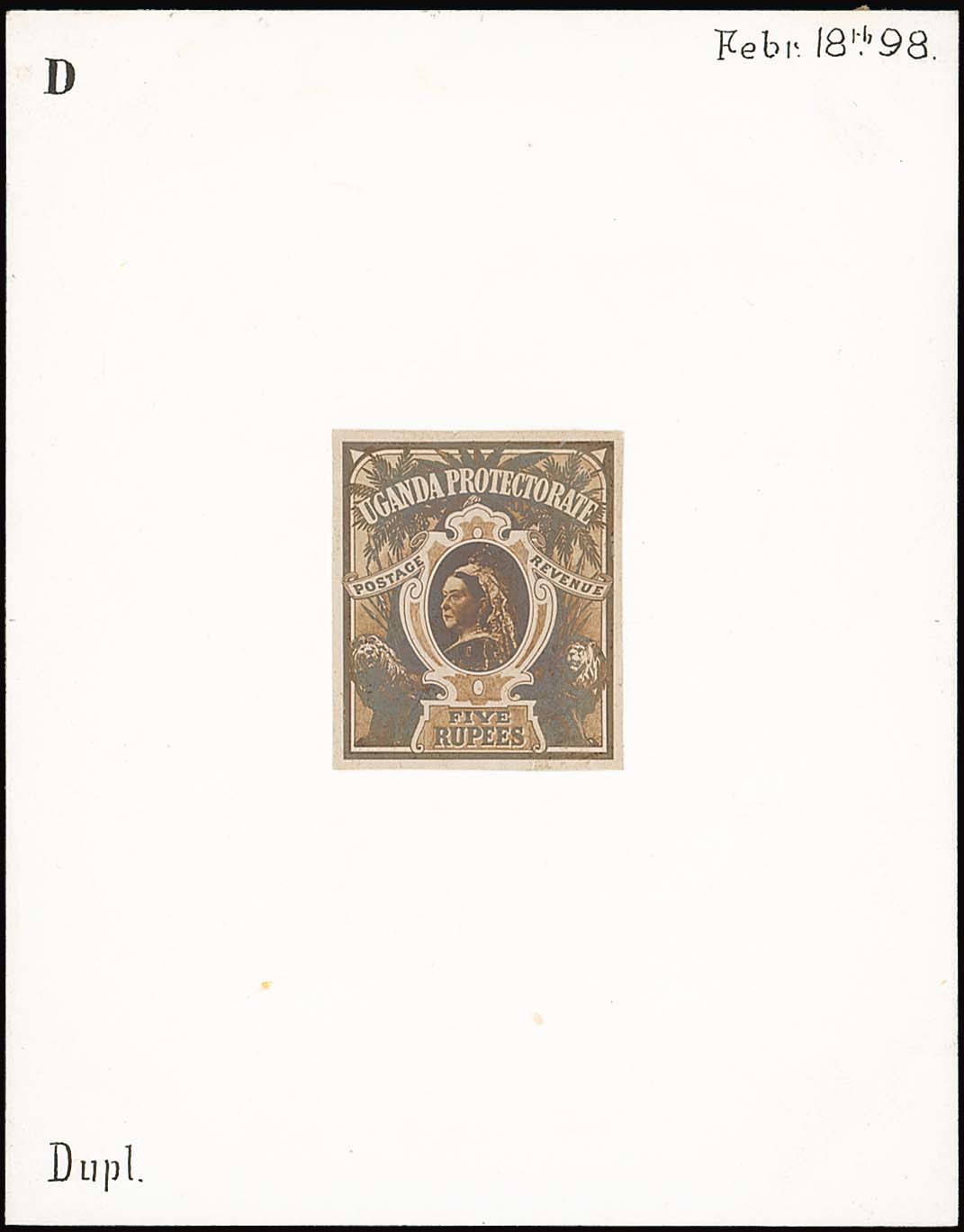 5r. stamp-size large format similar to issued design but lacking shading, affixed to card (90x115mm.) lettered "D" and dated "Febr 18th 98". Photo