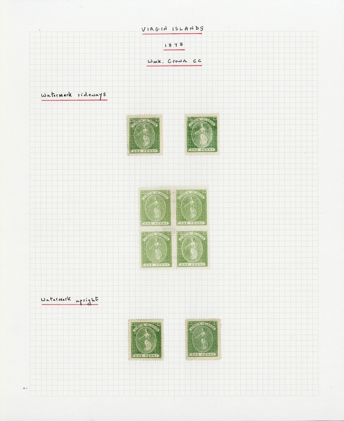 1878 CC 1d. yellow-green block of four and 1d. green (2, one without gum), all with watermark sideways, and 1d. green (2, one with colour offset on reverse) with watermark upright, large part original gum, some trimmed perfs. at right of block, otherwise fine. Also 1887-89 1d. rose to 1/- sepia each overprinted "specimen" (D12), large part original gum; 6d. with vertical gum crease, otherwise fresh and fine. S.G. 22, 22a, 22b, 34-40 £1,350