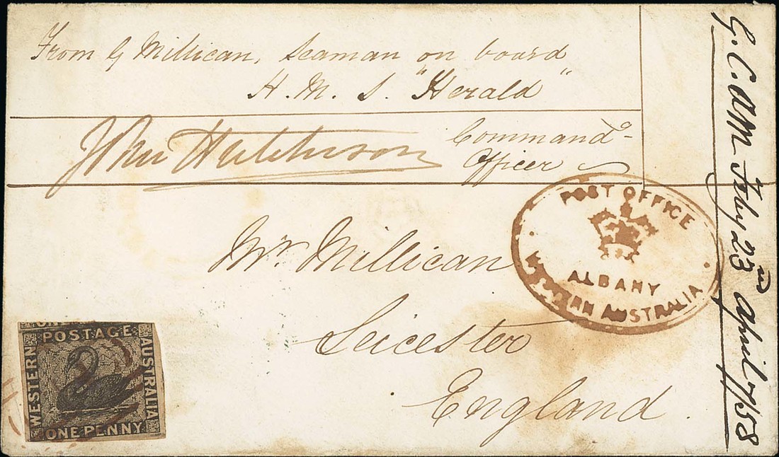 1858 (23 Feb.) sailor's envelope to Leicester, headed "From G. Millican, Seaman on board H.M.S. Herald", countersigned by Commanding Officer and bearing 1854 imperf. 1d. with margins virtually all round (just cut-into at top right) tied by void obliterator in brownish red, showing very fine "post office/Crown/albany/western australia" oval h.s in brownish red and, on reverse, clear arrival c.d.s. (7.4); some minor light age stains though an attractive and very rare soldier's rate cover, being one of only two recorded. B.P.A. Certificate (2007). Photo