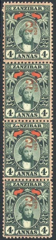 1897 (Jan.) "2½" on 4a. myrtle-green Type 5 vertical strip of four, fine mint. S.G. 177, £440