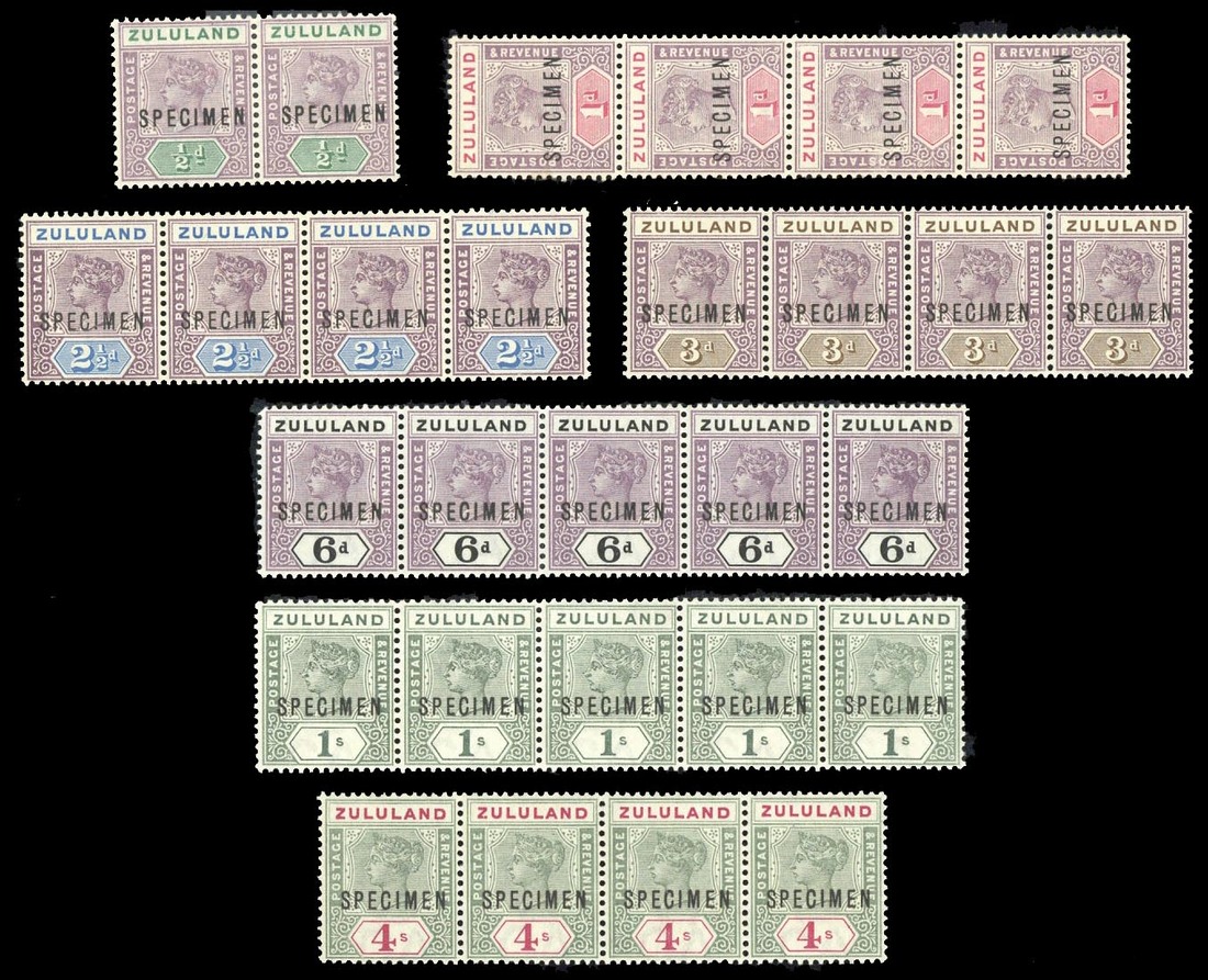 ½d. pair, 1d. vertical strip of four (one with broken "m" in "specimen", one with club foot to "m" and one with spur on "m"), 2½d., 3d. and 4/- strips of four, 6d. and 1/- strips of five, all overprinted "specimen" (D12), fresh mint with all but one ½d. unmounted. A very fine and rare group of multiples