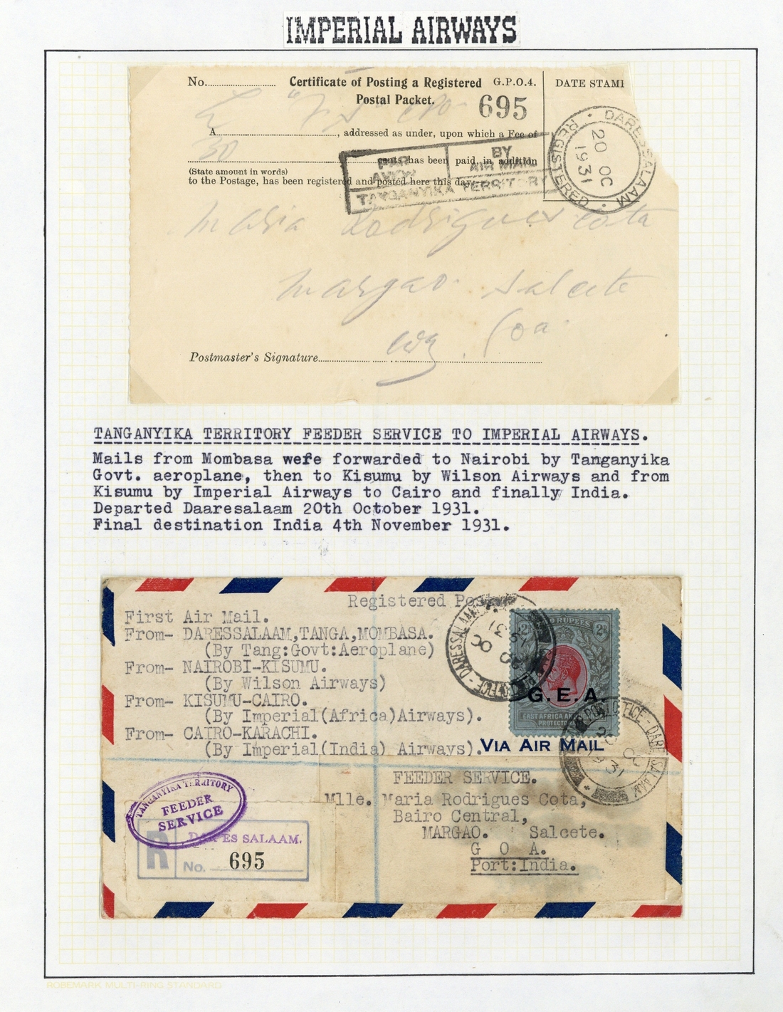 Imperial Airways: 1924-39 Collection (37 flown covers and seven postcards of aircraft) on leaves, including 1927 (March) Cairo-Uganda, 1929 (March) London-Jerusalem Irish acceptance, also return flight, 1929 (Dec.) Dublin-Jodhpur, 1931 (April) London-Australia "City of Cairo" crash (without markings), 1932 (Jan.) Cape Town to Mirabella Bay, Nairobi acceptance, 1936 (Oct.) Lagos-London, etc., chiefly fine