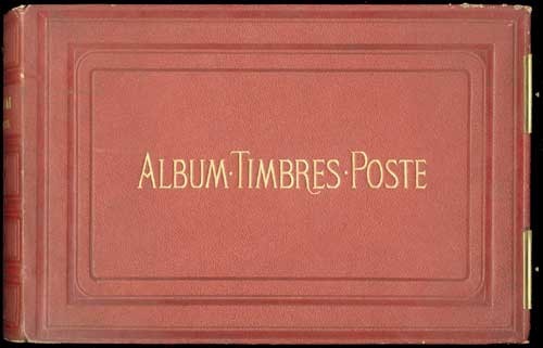 "album . timbres . post", Justin Lallier, 1869, eighth edition, red leather binding with gold tooling to front and on the edges of the internal leaves, and including a few stamps of little value in the album; some very minor scuffing and the closing clasps missing, though not affecting the fine condition of this early album. Very rare