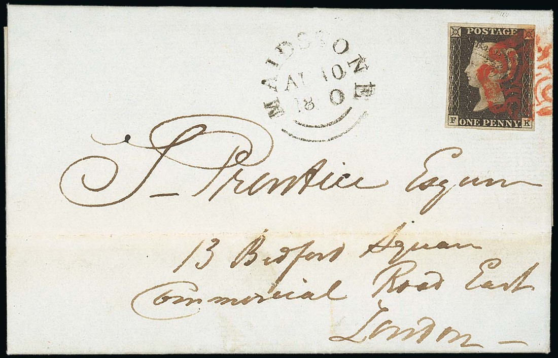 FK a delicate impression with good to large margins all round, tied by red Maltese Cross cancellation which leaves the Queen's profile clear, on entire letter, dated 10 April 1840 to London and with Maidstone c.d.s. alongside; horizontal filing fold well clear of the adhesive; fine and attractive. Photo
