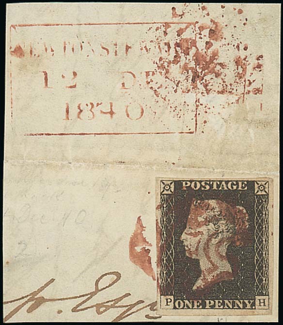 PH good to large margins all round, tied to piece by magenta Maltese Cross cancellation and with framed "newton stewart/12 dec/1840" datestamp in the same colour on reverse; vertical filing fold through the adhesive; fine. A rare and striking piece. R.P.S. Certificate (2004) for a part lettersheet. Photo