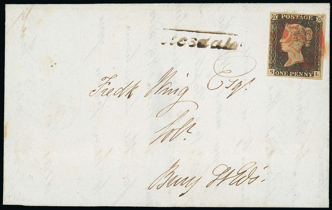 SL grey-black shade, slightly worn impression, variety double frame lines at top and right, red Maltese Cross cancellation, on entire letter with small portions at corners excised, dated 28 June 1840, to Bury St. Edmunds, with "(B)otesdale" (with 'Penny Post' removed) alongside; clean horizontal filing fold at foot; fine and a rare combination. Photo