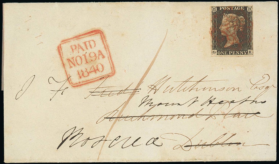 GK small to large margins all round, tied by red Maltese Cross cancellation to entire, dated 18 Nov. 1840. from Tullow to Dublin, redirected to Roscrea, red double lined Paid datestamp on the front and with manuscript "1" for the redirection, Tullow (18.11) and red Dublin diamond (19.11) datestamps on reverse; Fine. A rare redirected Penny Black cover within Ireland. Photo