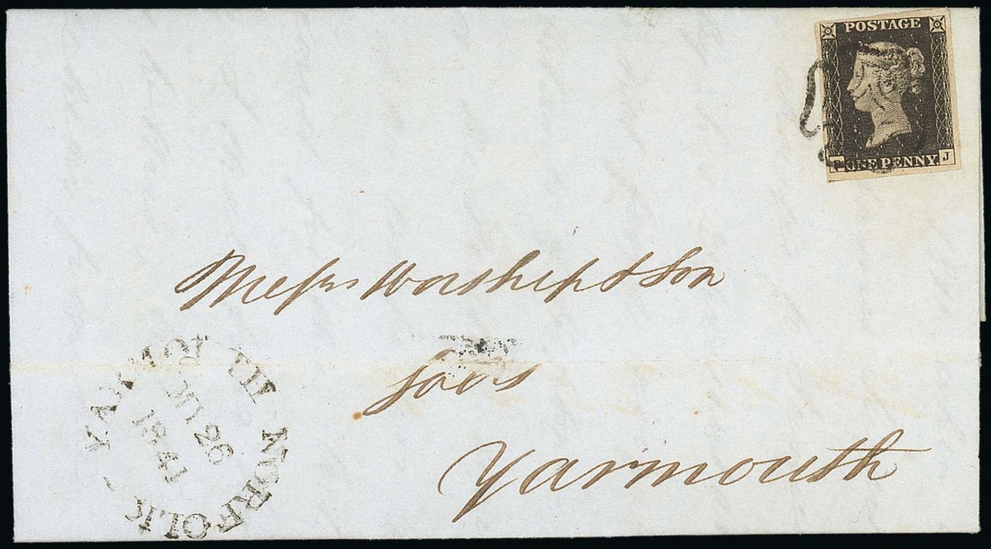PJ (P with small loop), grey-black shade, slightly worn impression, small to huge margins and showing a trace of the adjoining stamp at lower right, tied by crisp black Maltese Cross cancellation to entire letter, dated 25 May 1841, from Lowestoff (sic) to Yarmouth, dated markings on front and reverse; light horizontal filing fold well clear of the adhesive, fine. Photo