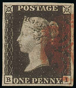BI intense black shade, large margins all round, slightly oily red Maltese Cross cancellation which leaves the Queen's profile clear; fine and a most appealing example. Photo