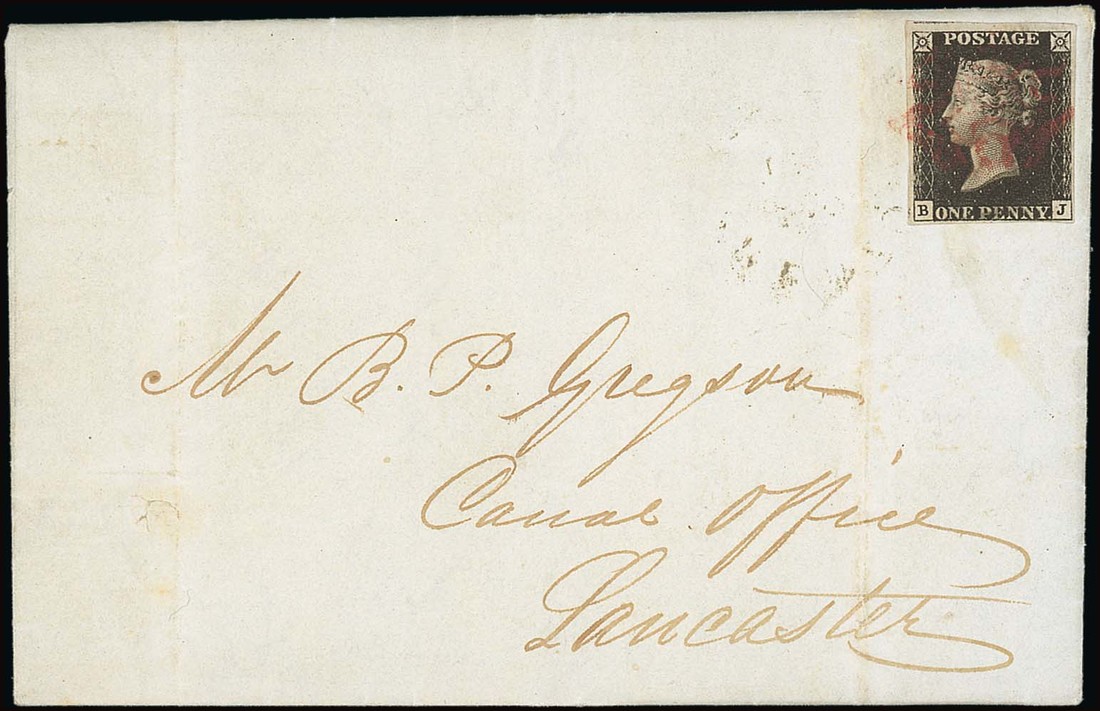 BJ small to large margins and showing a portion of the adjoining stamp at top, tied by magenta Maltese Cross cancellation to entire letter, dated 25 Jan. 1841, to Lancaster, Preston c.d.s. on reverse; filing folds well clear of the adhesive, fine and rare. B.P.A. Certificate (2015). Specialised AS25vd, £15,000. Photo