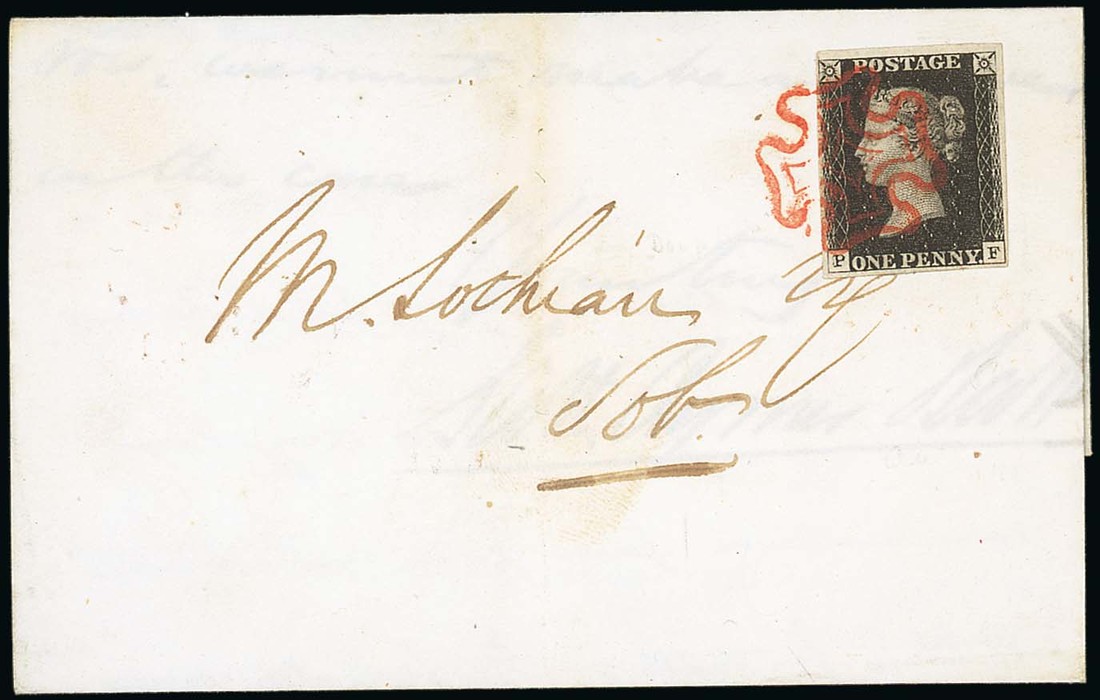 PF double letter "P", good to very large margins all round, tied by an exceptional red Maltese Cross cancellation in a vermilion shade, to entire letter, dated 21 Aug. 1840; light vertical filing fold well clear of the adhesive, fine. Photo